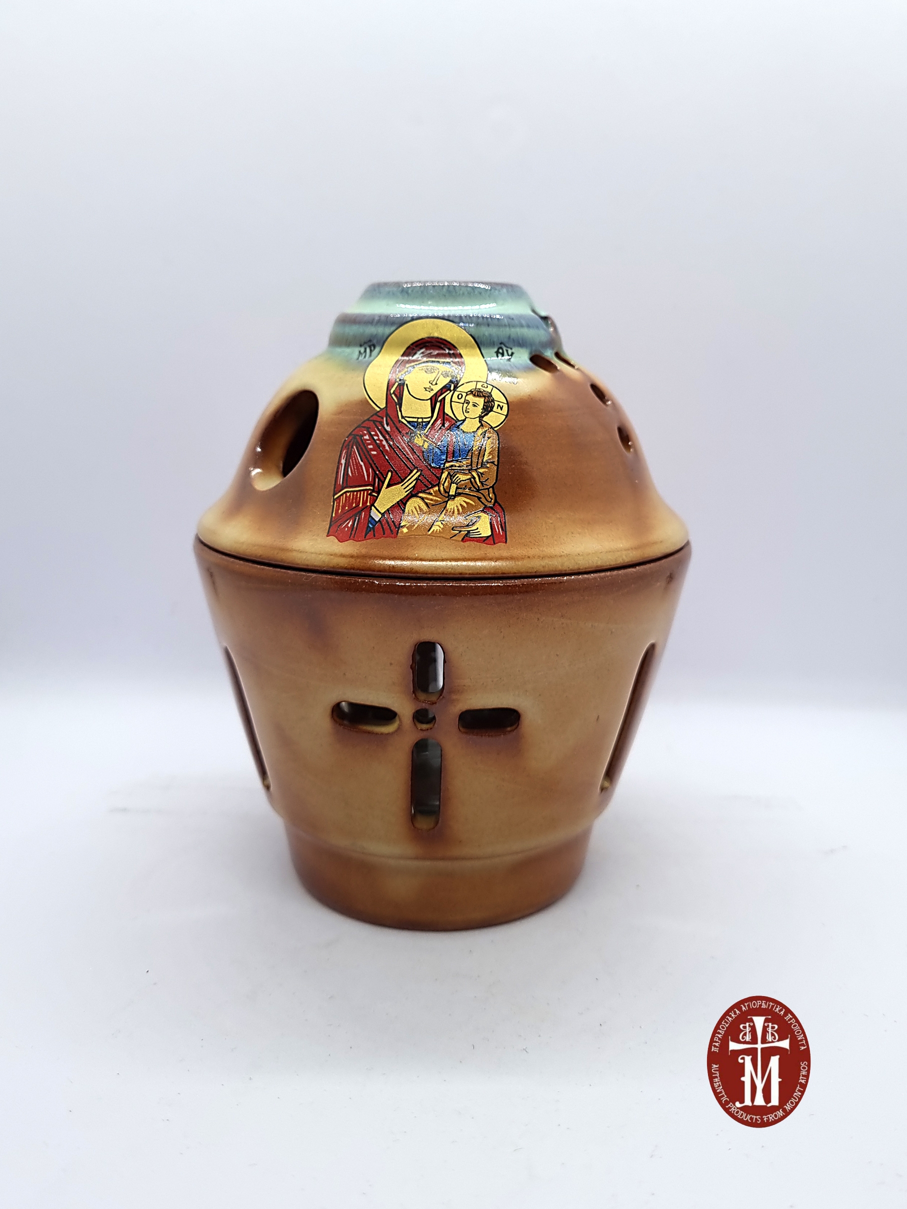 Table-top ceramic glazed bicolor candlestick with the image of the Virgin Mary.