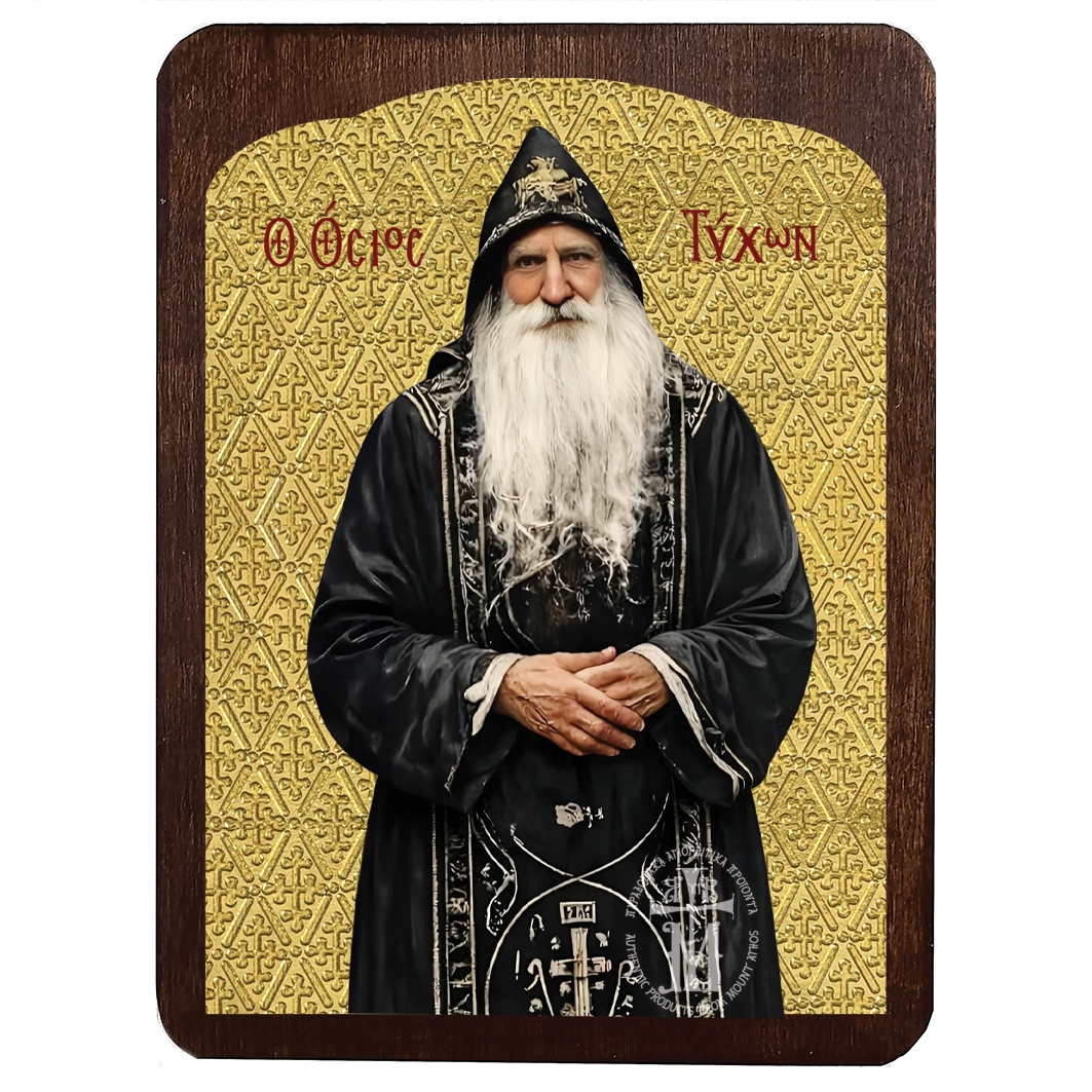 Ο Παπά-Τύχων παρέμεινε στοΆγιον Όρος για περισσότερα από 60 χρόνια, αποτελώντας ένα «ζωντανό στολίδι» του μοναχισμού. Η παρουσία του ήταν καθοριστική για τον τότε νεαρό μοναχό Παΐσιο, ο οποίος βρήκε στο πρόσωπό του τον απόλυτο πνευματικό οδηγό, διδασκόμενος από την απλότητα και την ακτημοσύνη του Ρώσου γέροντα.Μοναδική βυζαντινή μεταξοτυπία με φύλλο χρυσού επάνω σε καμβά αγιογραφίας φιλοτεχνημένη με την τεχνική του στιλβωτού τσουκάνικου. Τα υπέροχα χρώματα και τα εκπληκτικά βυζαντινά ανάγλυφα σχέδια παραμένουν αναλλοίωτα στο πέρασμα του χρόνου. Συνοδεύεται από πολυτελή κασετίνα.